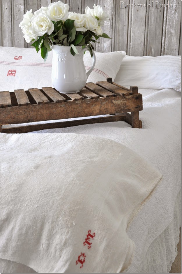 When the sun popped out, I snapped some photos of the pretty white roses my husband gave me :) I thought this French fruit crate would serve as a nice bed tray. I love to see how many different ways I can use a vintage piece…you know the things you find at a flea market, the ones you really love, and you’re not sure how you’ll use it?